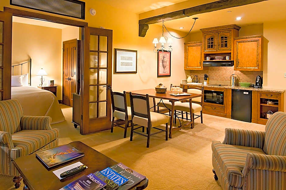 French doors separate the bedroom from the living and dining areas in this suite. A fully-equipped custom kitchen with a microwave and refrigerator is provided.